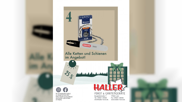 Alle Ketten und Schienen im Angebot. Praktisch für deinen Wintereinsatz. Heute 25 Prozent Rabatt bei Haller Forst und Gartengeräte. Solange verfügbar.